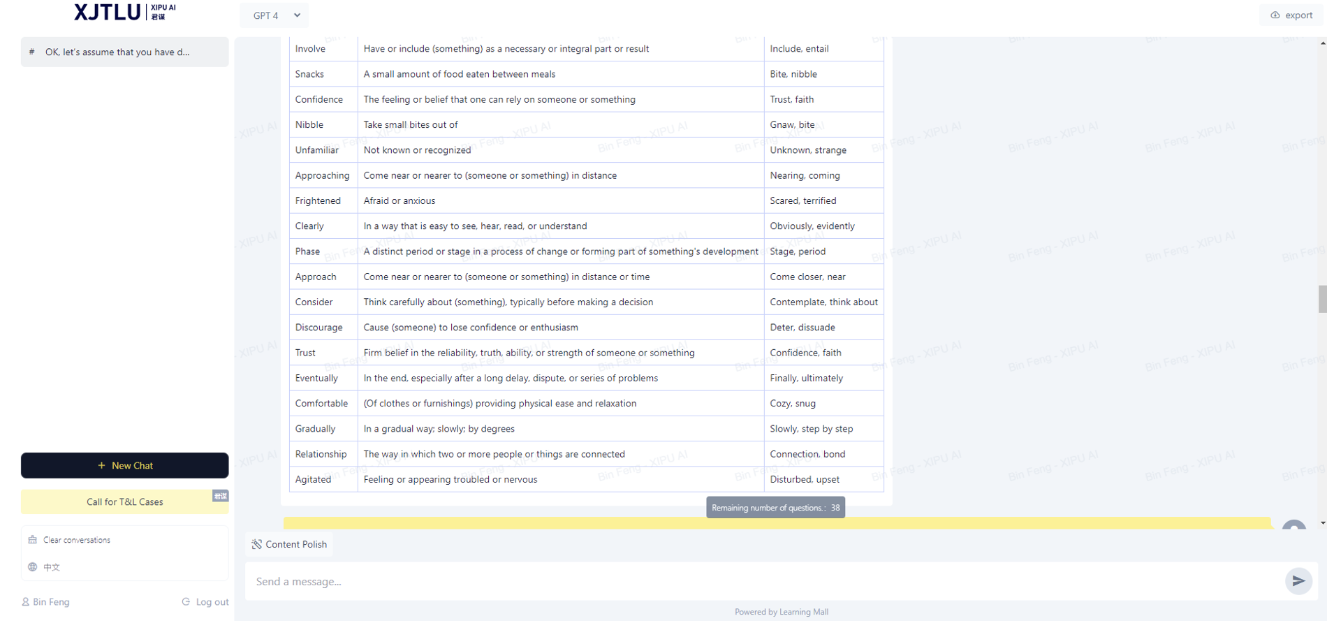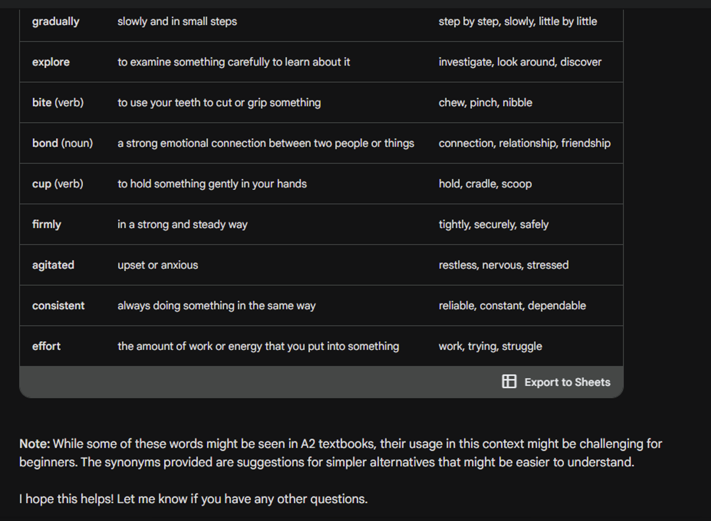 Traditionally, the compilation of a challenging word list demands painstaking manual effort, involving a meticulous examination of transcripts and dictionaries. With AI, however, the identification of these words was accomplished within seconds of submitting the transcript along with prompts such as “Identify words beyond A2 level” and “Provide definitions and synonyms in a table” Both XIPU AI and Bard responded effectively, as depicted in Picture 1 and Picture 2. Notably, the GPT3.5 version on XIPU AI requires more rigorous human review compared to the more advanced GPT 4.0 version or Bard (See Picture 3).