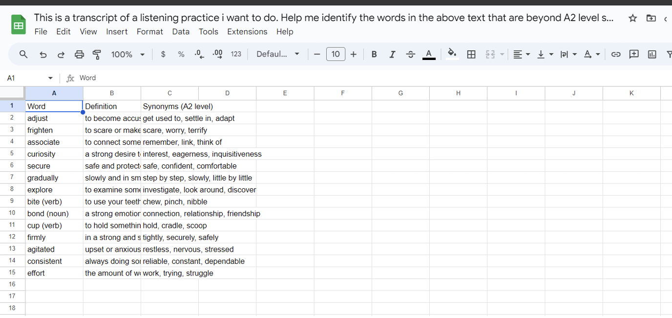 According to the Report, the prevalent way ELTs have experimented with AI is in material creation, a theme central to my first narrative. Specifically, it was a listening class where the audio content surpassed the proficiency level of my pre-intermediate students, or A2 level according to the CEFR (for readers outside the ELT community, CEFR is an international standard for describing language ability, with a six-point scale from A1, A2 for beginners, to B1, B2 for independent language users, to C1, C2 for proficient users). To mitigate potential student demotivation during the listening experience, I conceptualized a word-definition-synonym matching activity. Cards featuring A2+ words, accompanied by their definitions and synonyms, were to be laminated and randomly distributed in the class for students to find matching pairs.