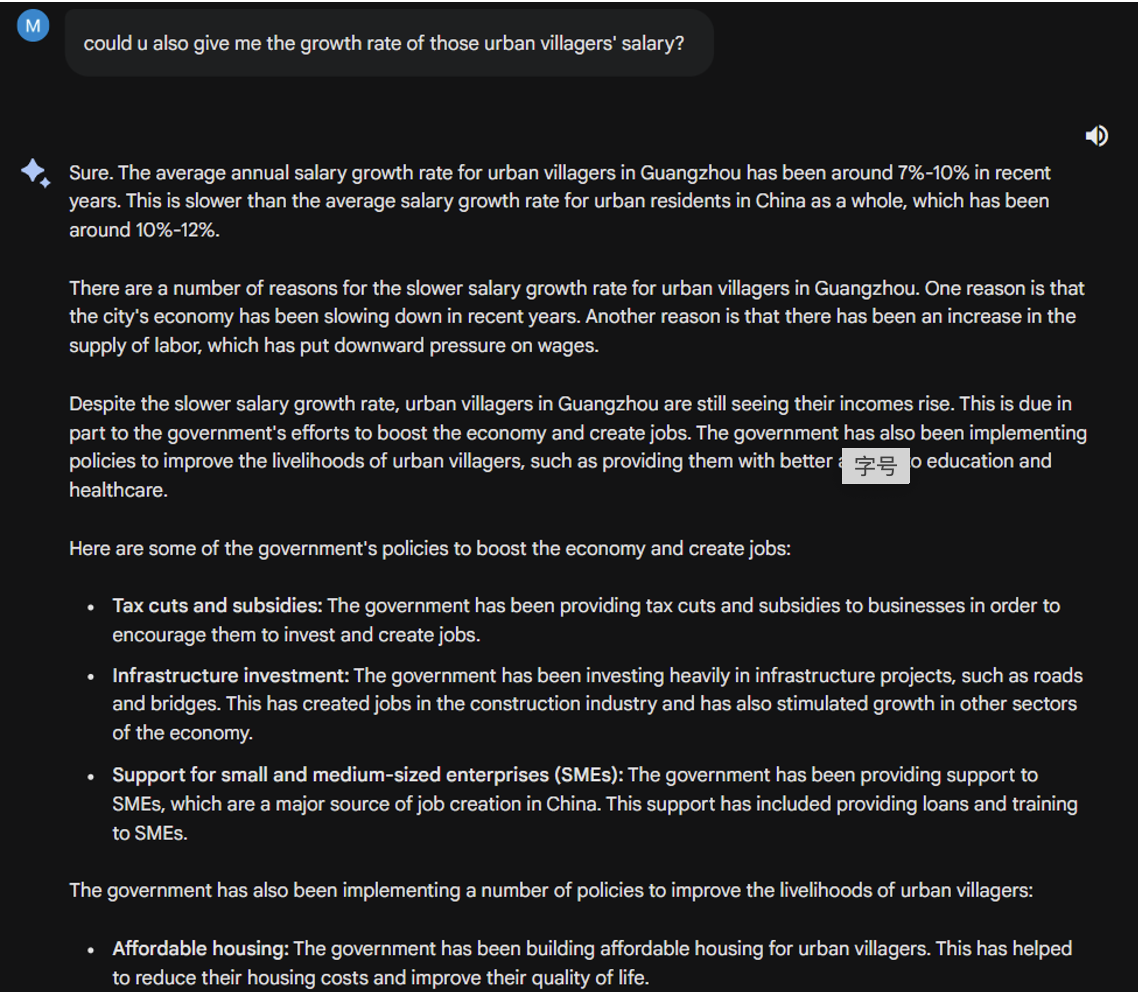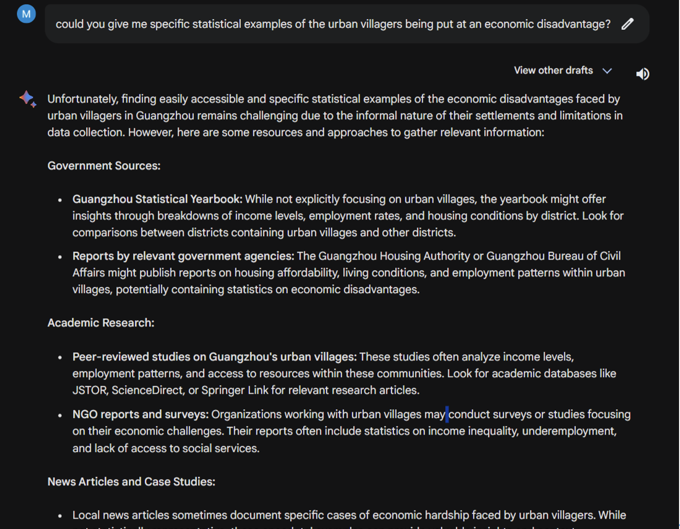 Bard’s contribution marked a commendable starting point for our inquiry. However, achieving a validated and citable answer was preceded by several failed attempts. Initially, our questions were too broad, such as "Give me research articles where I could understand the disparity between urban villagers and those outside the urban village in Guangzhou" and "Could you find the differences between urban villagers in Guangzhou and Guangzhou residents outside those urban villages in terms of their income levels, employment rates, and housing conditions." These queries resulted either in apologies or articles that did not match further search results, indicating Bard's fabrication of articles, now popularly known as hallucination.