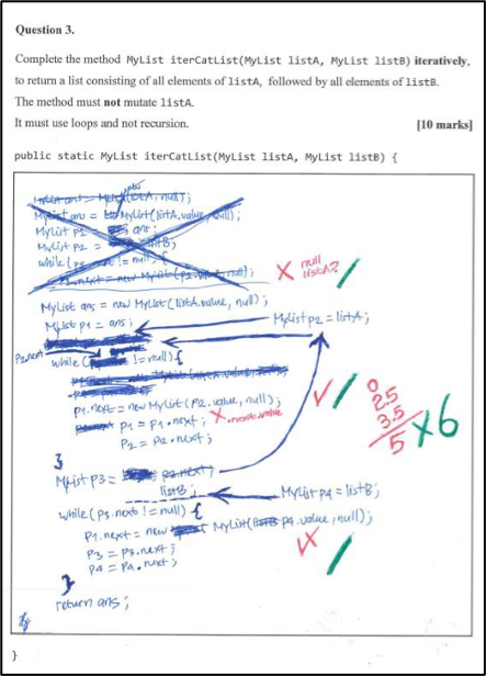 在现代计算机编程课上,我们会教学生如何在计算机上编写计算机代码,包括学习如何借助支持性工具进行编程,如集成开发环境(IDE)和可视化工具。因此,如果我们还是按照传统考试的形式让学生在试卷上手写代码,然后对他们的编程技能进行打分,这就似乎有些讽刺了,即使传统的考试形式就是如此。如果以这种形式进行考试,学生无法撤消错误,也无法删除错误答案或插入新行,但如果上机操作考试的话则完全没有这些问题。此外,传统考试形式也无法使用学生们较为熟悉的计算机上的自动格式化或拼写检查功能。因此,改卷老师难以看懂答卷,更不用说打分了。之前我们见过学生手写代码,但半天都不知从何看起。