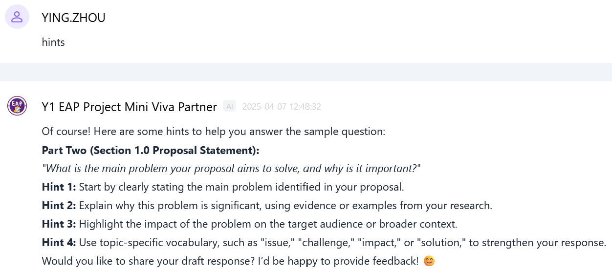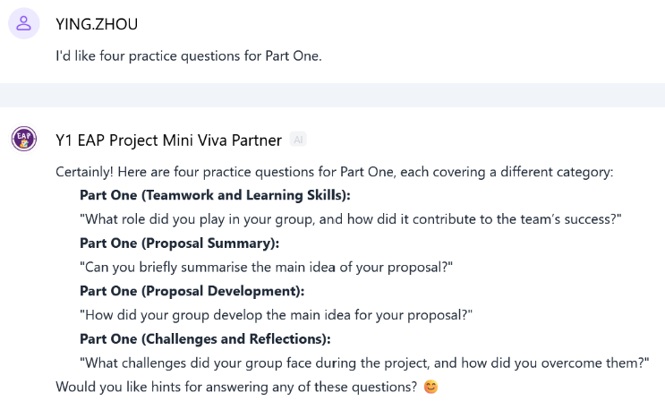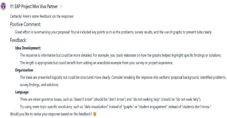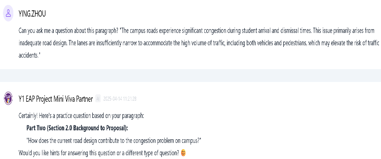 在大一第二学期,另一款AI智能体Mini Viva Partner则用于支持 Mini Viva(小型答辩)的备考,该考核旨在测试学生对其已提交的书面提案写作的理解程度。该智能体可生成两类练习问题:(1)与正式考试题型一致的常规性问题(见图9),(2)基于每位学生各自的写作而量身定制的问题(见图10)。此外,它还提供指导性的答题结构及文字反馈(见图11和图12),帮助学生优化回答内容,增强自信心与口头表达能力。
