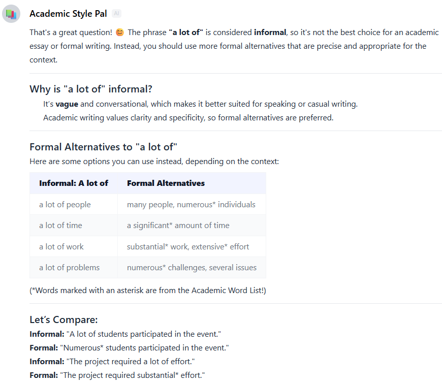为支持学生在写作任务中所需的学术素养发展,团队开发了三款AI智能体:Academic Style Pal、XJTLU Harvard Cite&Ref Pro以及Paraphraser and Summariser。首先,Academic Style Pal旨在面向学术写作初学者,帮助尚不熟悉正式学术语言的学生入门。与主流通用型生成式 AI聊天机器人(GenAI chatbots)所提供的泛化回答不同,该智能体通过结构化的方式引导学生探索正式与非正式用语的差异。当学生询问某个词汇的用法是否正式时,智能体首先会引导其在不同语境中分析用语选择,然后再提供更正式的替代表达及更丰富的学术写作示例(见图13)。此外,智能体会在 AWL 词项后标注星号(*)以便学生参考。