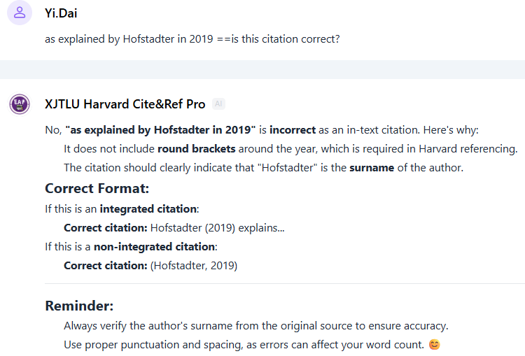 第二款写作AI智能体为XJTLU Harvard Cite&Ref Pro,用来帮助大一学生掌握符合西浦特定Harvard格式的引用与参考文献规范,为初次接触引用规则的EAP学生提供情境化指导。该智能体可提供清晰、即时的引用及参考文献编写规则说明,并结合实践示例(见图15),以帮助学生准确理解并应用相关技巧。此外,它还可对学生引用与参考文献中的错误提供讲解(见图16),引导学生自行修正以符合学校要求。这些功能不仅提升了学生在引用方面的技能,也通过强调正确引用信息来源的重要性,进一步促进学术诚信的养成。然而,该工具仍存在一定局限性。例如,当上下文信息不明确时,可能无法准确识别作者姓氏,且无法验证网址(URL)或 DOI 是否有效,这在一定程度上限制了它的核查能力。为此,指令中已加入声明提示,提醒用户需自行核对相关信息。未来版本可考虑支持更多引用格式,以满足更广泛的学术使用需求。