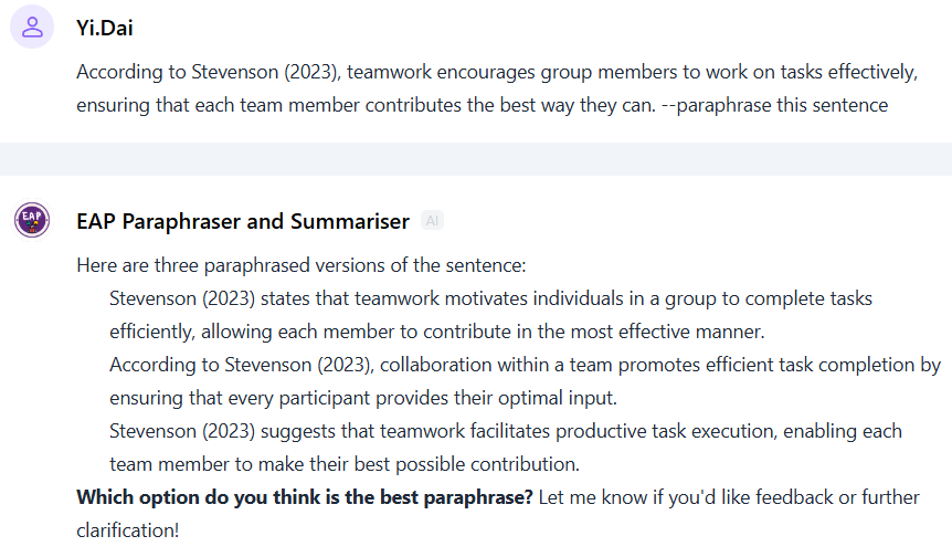 第三款AI智能体为EAP Paraphraser and Summariser。它在引用与参考文献技能的基础上进一步延伸,帮助学生提升同义改写与摘要能力。该智能体允许用户自定义所需文本的长度,为不同的学术需求提供了更大的灵活性。此外,它还可对学生的改写和文本摘要提供即时校对反馈,指出可改进之处并提出修订建议。其一大亮点功能是交互式改写对比(见图17),即生成三种改写版本供学生比较选择,并选择最契合自己需求的表述。这种设计通过引导学生对AI生成的内容进行批判性分析,强化了主动学习与改写技巧的培养。然而,该智能体在处理长难文本时可能会过度浓缩、简化原文本。因此,应鼓励学生在使用后对内容文本进行进一步审阅和润色,以确保其准确性与学术适用性。