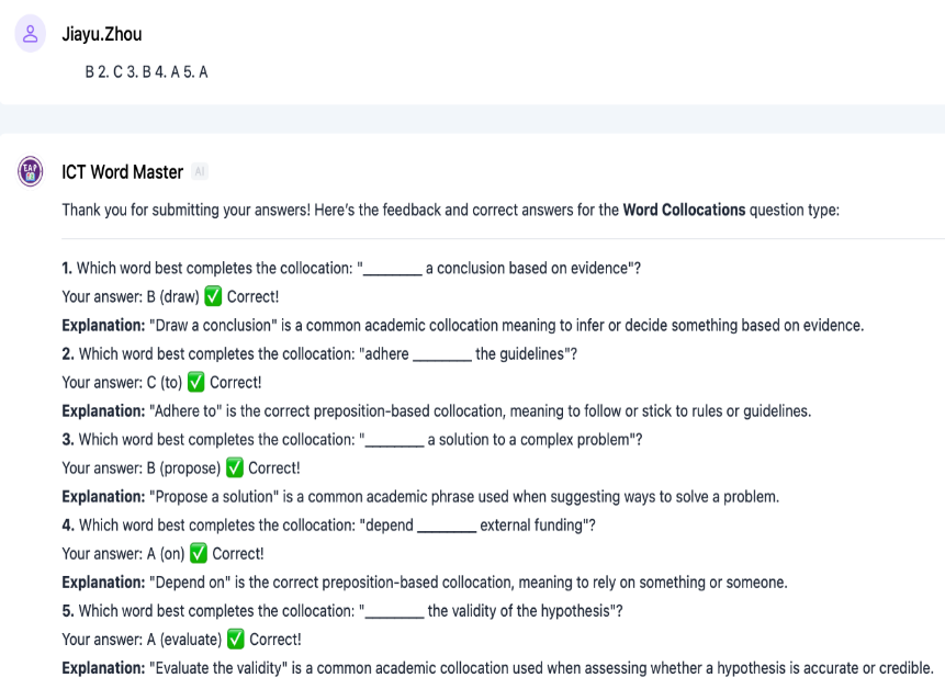 尽管功能多样,ICT Word Master 仍存在一定局限性。例如,在设计选择题时,尽管指令(Prompt)中明确要求随机化选项,系统仍倾向于过度使用选项“A”作为正确答案。这一偏差可能源自生成任务的复杂性,导致系统默认优先选用“A”。此外,该工具生成题目时更多地侧重AWL中的词汇,这可能弱化对每周主题词汇的覆盖;若学生仅依赖此工具进行复习,可能造成词汇掌握不均衡。这些局限提示我们有必要持续优化工具并辅以其他教学策略,以实现更平衡、有效的词汇学习。