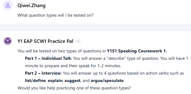 在本项目中,AI智能体作为数字化支架,根据EAP学生的实际需求量身定制,设定了明确的学习目标,如拓展词汇量、提升口语流利度及加强学术写作能力。每个工具均结合考核要求,并考虑学生的当前水平,提供比通用型AI工具更具针对性的支持。正如 Wass et al. (2011) 所指出,支架式支持不仅可以来自教师,也可以来自其他来源。在本项目中,AI智能体作为实时获取、按需使用的教学工具,拓展了课堂外的学习机会,补充了传统语言教学的方式。