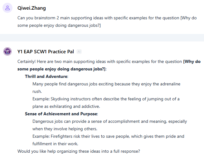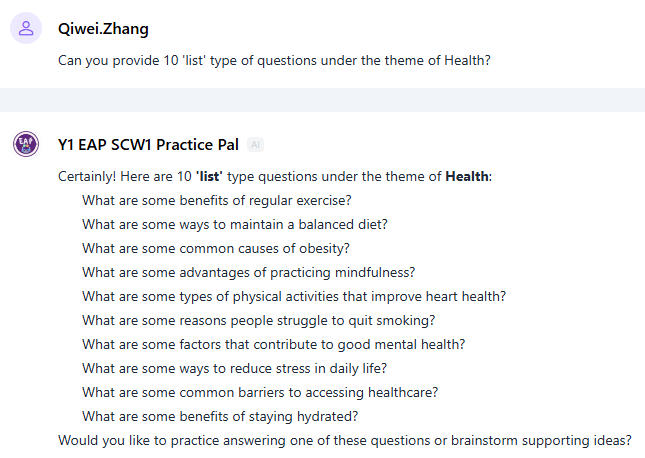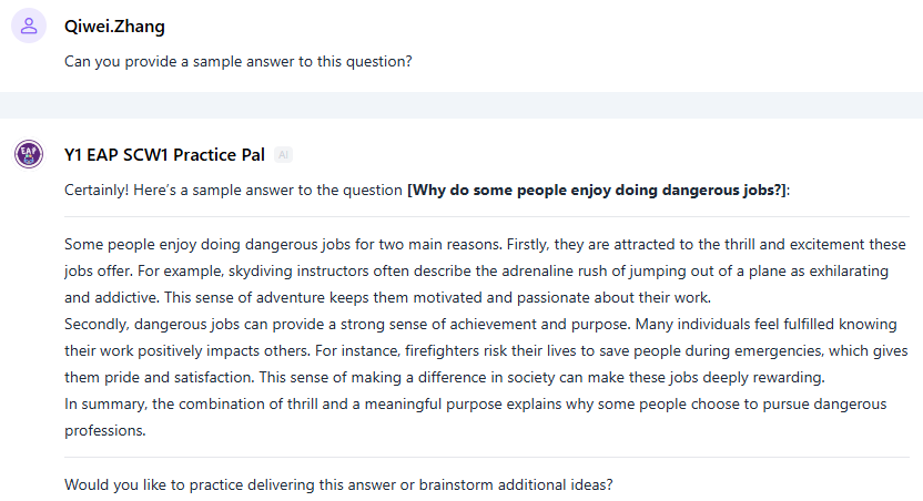为帮助学生准备口语考试,团队开发了两款 AI智能体,以满足上下学期不同考试类型的具体要求。大一第一学期的口语考试侧重于考察学生围绕指定话题展开观点的能力,以及在对谈提问中即时应答的能力。SCW1 Practice Pal专门用于帮助学生理解考试要求(Tasksheet)中明确的考核要点(见图5),根据课程每周主题生成模拟练习问题(见图6),围绕指定话题发散思维(见图7),并生成答案范例(见图8)。通过与该智能体的互动及示例学习,学生将掌握有效的策略,学会如何在答题中有逻辑地组织观点,并通过具体示例和细节扩充回答内容。