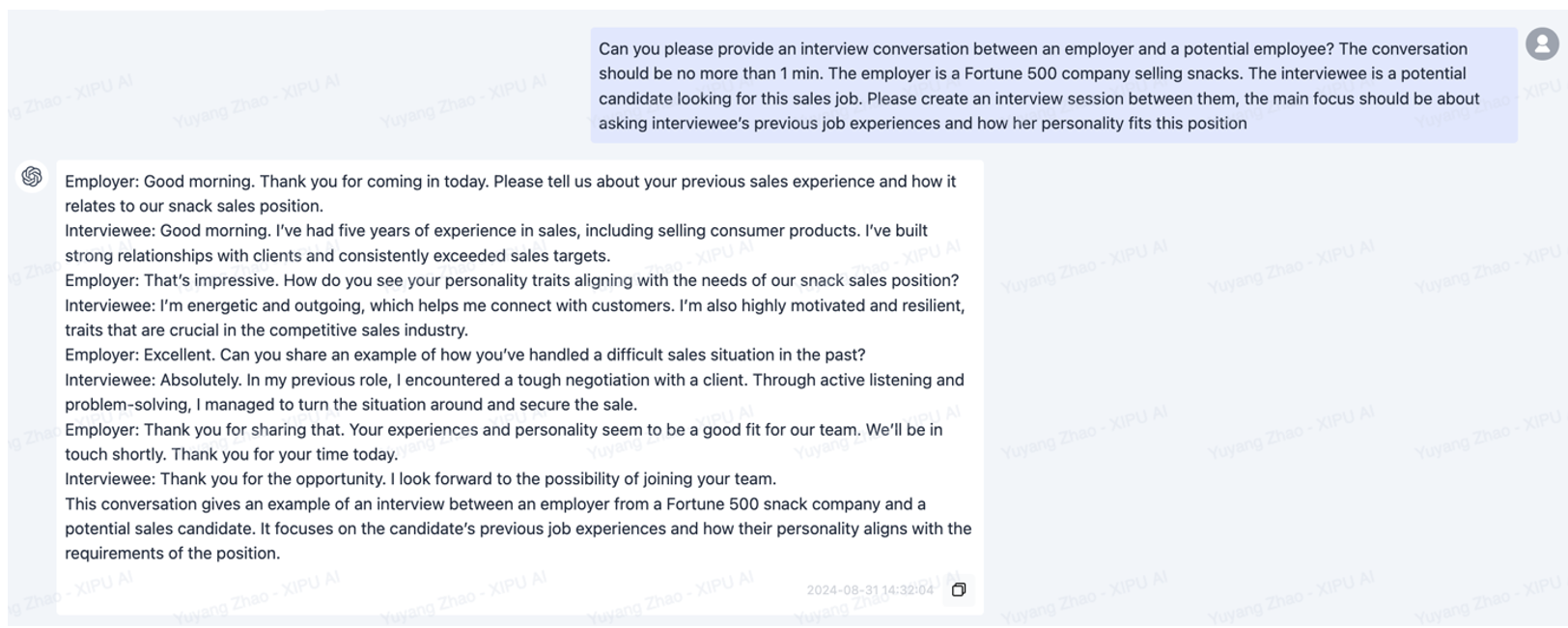 在交际语言教学(CLT)理论的指导下,设计语言学习活动时应遵循几个原则。首先,活动应包含鼓励使用目标语言的互动成分;其次,活动应使用真实应用情景的材料,以促进学生的学习体验;第三,学习活动应融入学习者的个人经历,从而提高课堂参与度(Nunan, 1989)。这些要素协同作用,旨在培养学生的交流能力,包括:1)能够将语言应用于各种目的;2)调整语言使用以适应特定环境并与特定群体交流的能力;3)理解和生成各种文本的技能;4)在语言能力受限的情况下,仍保持沟通的能力(Richards, 2005)。在这一框架下,我发现XIPU AI可以成为创建课堂互动材料的有效工具。例如,在我的课堂中,经常使用的一项活动是面试场景,学生需要根据给定的情境进行对话。让他们能够发挥想象力、处理情境信息、创造自己的对话并练习目标语言的使用。