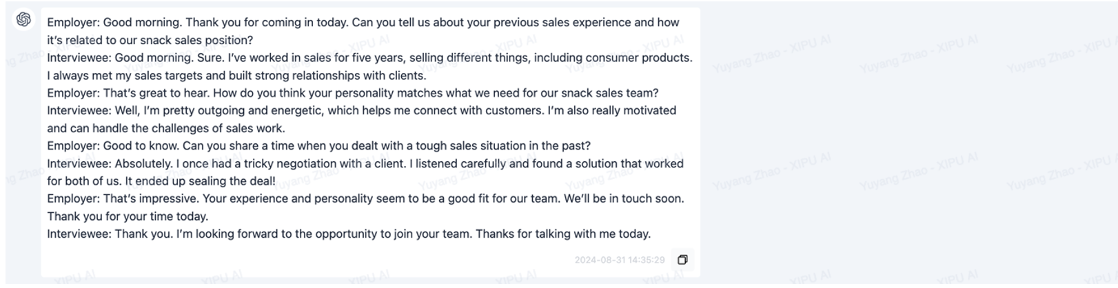 以具体例子为例,我使用君谋(XIPU AI)生成了一个财富500强零食公司与潜在候选人之间的面试情境。在设计这类面试场景活动时,需要注意的是,虽然这类场景能够为学生们提供创造自己面试对话的空间和能力,面试情境的设计应易于学生理解,发挥想象力,从而创造出符合目标语言的对话。如图4所示,我首先输入了提示:“你能提供一段雇主与面试者之间的面试对话吗?对话时间不超过1分钟。雇主是销售零食的财富500强公司,面试者是申请销售职位的候选人。请创造一个面试场景,重点是询问面试者的工作经历以及她的性格如何适合该职位。” 基于这一提示,君谋(XIPU AI)生成了一段相对符合要求的面试对话。然而,部分短语和表达过于正式,因此我进一步要求AI“调整对话的正式程度和语言难度水平”。经过修改后,君谋(XIPU AI)生成了修改后的对话,满足了大部分的要求(图5)。