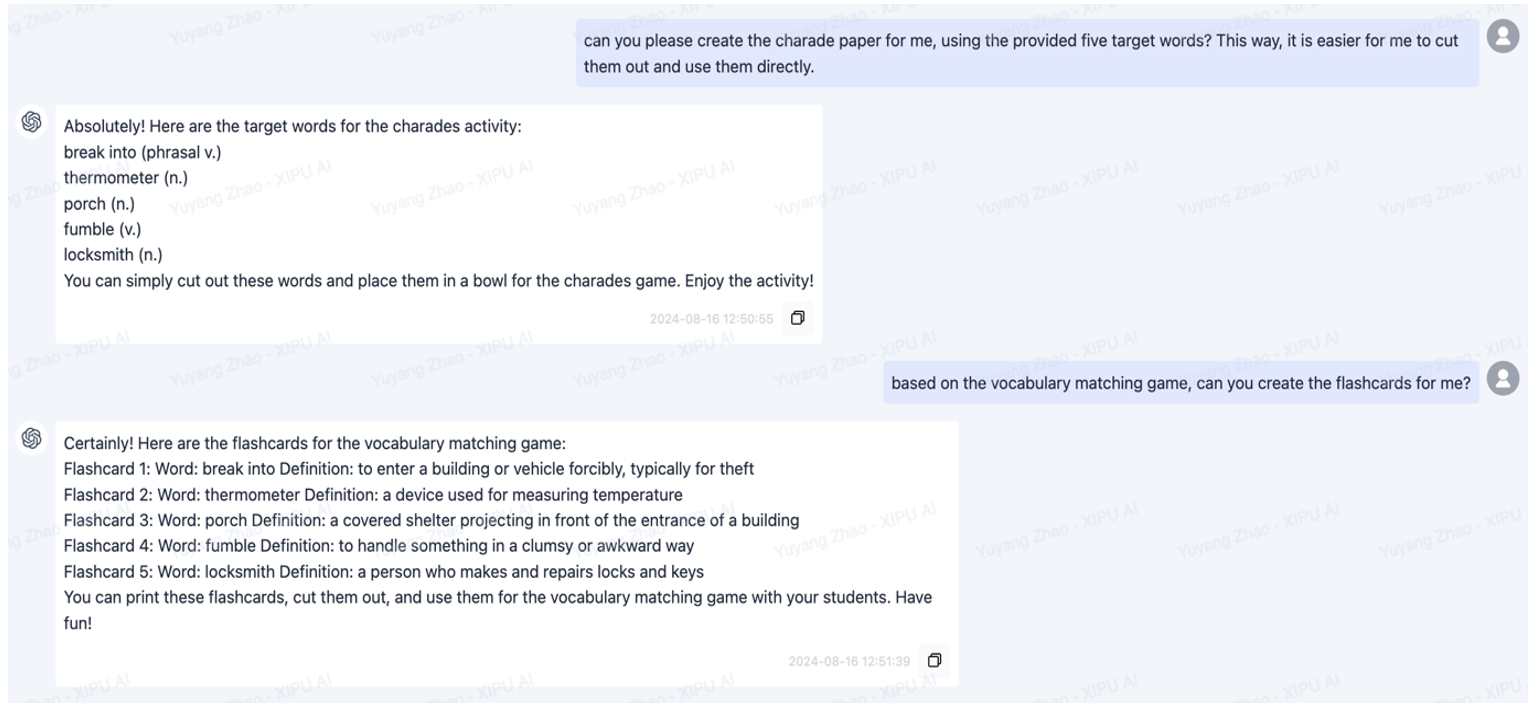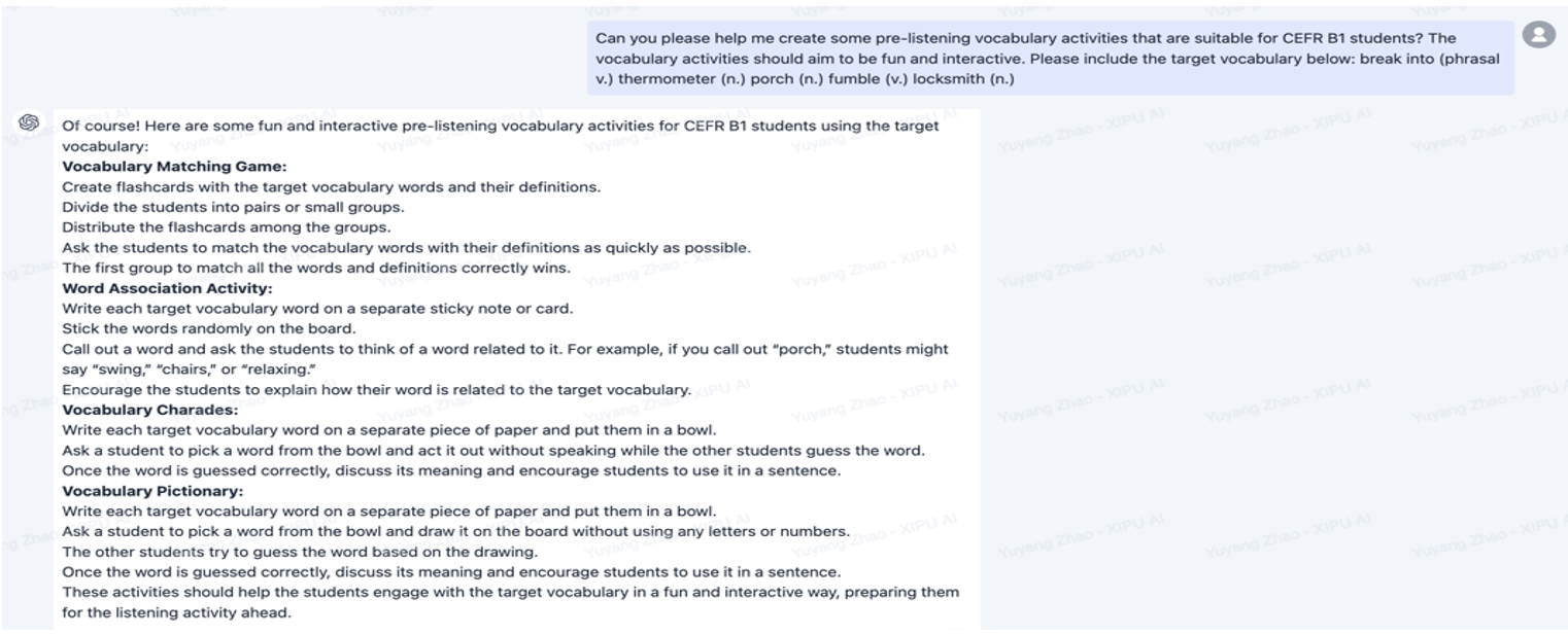 人工智能在英语教学中的一个最有前景的应用是其扩展和增强课堂活动的潜力。例如,在为我的持续支持课程创建听力热身活动(warm-up)时,出于对君谋(XIPU AI)在课程活动创作的好奇,我在君谋(XIPU AI)中输入了以下提示(图6):“请帮我创建适合CEFR B1学生的听力热身词汇活动,这些词汇活动应具有趣味性和互动性。请包括以下目标词汇:break into (短语动词)、thermometer (名词)、porch (名词)、fumble (动词)、locksmith (名词)。” 君谋(XIPU AI)基于我的请求,提供了几种经典且互动性强的活动,这些活动可以融入我的课堂。然而,我还想了解AI是否能够进一步帮助我创建提到的现成材料。因此,我继续请求“请为我创建这五个目标词汇的哑谜猜字游戏,这样我可以直接剪下来使用。” 不出意外,AI无法直接为我创建这些角色扮演卡片。然而,当我请求类似的词汇匹配游戏时,君谋(XIPU AI)为每个目标词提供了详细的解释,这节省了笔者制作词汇定义的时间(图7)。