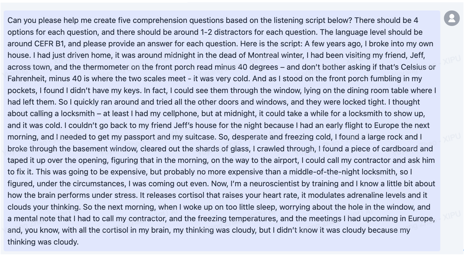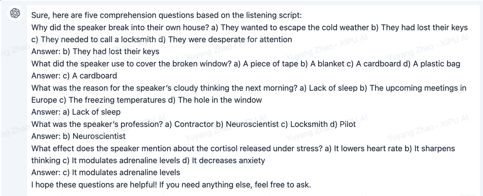 听力技能是语言学习中的一个重要组成部分,然而,在时间有限的情况下为学生设计有效的听力评估对教师来说可能是一个挑战。在这种情况下,AI可以通过协助开发既全面又适合学生语言水平的评估材料,发挥重要作用。例如,AI能够从多种音频资源(如播客、新闻广播和对话片段)中生成听力练习,确保学生接触到不同的口音、语速和情境。以我的听力工作坊为例,基于TED演讲,我使用XIPU AI生成了一套听力理解问题,以帮助学生练习听力理解技能。值得再次强调的是,当要求AI执行任务时,提供全面且准确的提示至关重要。鉴于参加我工作坊的学生普遍需要更多的听力支持,我特别要求XIPU AI创建符合特定英语熟练度水平的问题。此外,为了有效评估学生的理解力,多项选择题的设计旨在考察学生对听力内容的理解,同时也故意增加了多个干扰项(图8和图9)。在某些情况下,如果学生需要更多的练习题,可以使用XIPU AI生成额外的练习集,并设置不同的难度级别。