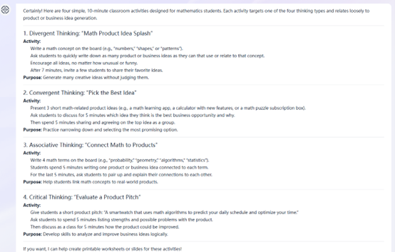 A lecture on the four types of innovative thinking - divergent, convergent, associative, and critical - risked remaining theoretical without application. To move from definition to practice, I prompted the AI: “Generate a short, simple, 10-minute classroom activity for each of the four thinking types (divergent, convergent, associative, critical). Each activity should be relevant to mathematics students and relate loosely to product or business idea generation” (see Image 3). These prompts were perfectly pitched. They were rooted in the concepts that students are familiar with while effectively pushing students into an entrepreneurial mindset for idea generation. I adapted these suggestions into a fast-paced tutorial station rotation, giving students concrete experience in mentally shifting between these different thinking modes.