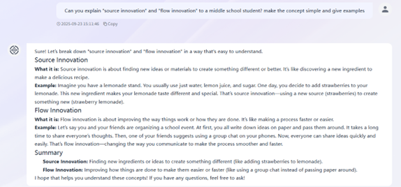 A primary example was unpacking the key distinction between source innovation (creating a new market or need) and flow innovation (improving existing solutions). The definitions from the lecture were abstract, so I prompted the AI: “Can you explain ‘source innovation’ and ‘flow innovation’ to a middle school student? Make the concept simple and give examples.” I asked the AI to explain the concepts to "a middle school student" to force a simple explanation with clear examples. The AI produced a concrete analogy: source innovation is like creating a whole new drink, such as strawberry lemonade, by using a new ingredient. Flow innovation is like improving how students share ideas - switching from passing notes to using a group chat to communicate faster and easier (see Image 1). This simple, concrete analogy became the centrepiece of my tutorial review. It not only cemented my own understanding but gave students a memorable mental model, allowing us to quickly move to more complex, discipline-specific applications, such as discussing source and flow innovation in the real business world.