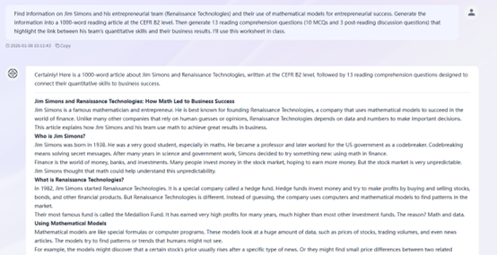 Beyond definitions, students struggled to see how “mathematical thinking” translated into real-world entrepreneurial success. To bridge this gap, I used XIPU AI as a research assistant, asking it to generate an article about Jim Simons along with reading comprehension questions (see Image 2). The AI provided a concise summary of Simons’s quantitative hedge fund and produced questions such as, “Why do you think using mathematical models can be better than relying on human guesses in investing?” This tailored case study served a dual purpose: it validated the module’s core premise by framing mathematics as a potent entrepreneurial tool, and it provided relevant material for students to practice the analytical reading essential for academic skill development. The AI-generated questions then scaffolded a focused class discussion, directly linking the weekly theme to a tangible, high-profile example.