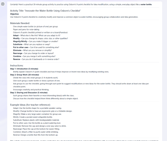 For more sustained engagement, I needed compelling, hands-on tasks. I turned to AI to brainstorm and detail these experiences. First, I asked: “Suggest a practical, 30-minute group activity to practice using Osborn’s 9-point checklist for idea modification, using a simple, available object.” The AI proposed the “Water Bottle Activity,” where groups take a standard water bottle and apply checklist questions like “Modify?” (Could its shape be changed?) or “Put to other uses?” (Could it be used as a tool?). It provided a full facilitator script (see Image 4). These AI-generated blueprints provided a robust, ready-to-use structure that I could then personalise, saving hours of design time while ensuring pedagogical soundness.