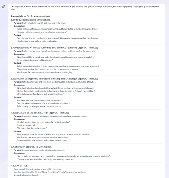 Beyond explaining the “what,” students needed a model of the “how” - how to structure a compelling 4-minute presentation that followed the requirements of the task sheet. I provided the suggested structure of the presentation to the AI and prompted: “This is the suggested structure of a 4-minute presentation. Generate a clear and actionable outline with specific headings, sub-points for content, and crucial signposting language”. The AI produced a coherent skeleton, structuring the presentation into five distinct parts that aligned precisely with the task sheet's specifications (see Image 6). This outline served not as a template to copy, but as a scaffolded model that visually mapped the expected structure and flow of an academic presentation. In class, we used this model to discuss the fundamental anatomy of a presentation and how to employ effective signposting language to guide the audience. This process demystified the assessment and empowered students to focus their efforts on developing strong content within a clear, confident structure.