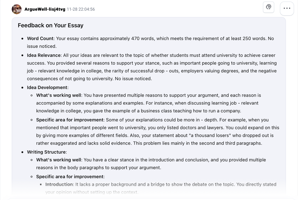 The provision of timely and substantive feedback is a cornerstone of effective writing instruction, particularly in English for Academic Purposes (EAP) contexts. However, a significant challenge arises in high-volume teaching scenarios. For instance, first-year advanced EAP students at XJTLU are required to write an argumentative paragraph or essay every week in the first half of the semester, yet their teachers struggle to provide the necessary feedback given the scale of instruction as each teacher often handles 70-100 students. This situation creates a critical feedback gap, where the demand for quality feedback far outstrips the instructor's capacity to supply it. This challenge is intensified by the high stakes of argumentative writing, which constitutes a substantial portion of the module grade, making accurate and pedagogically grounded support essential.