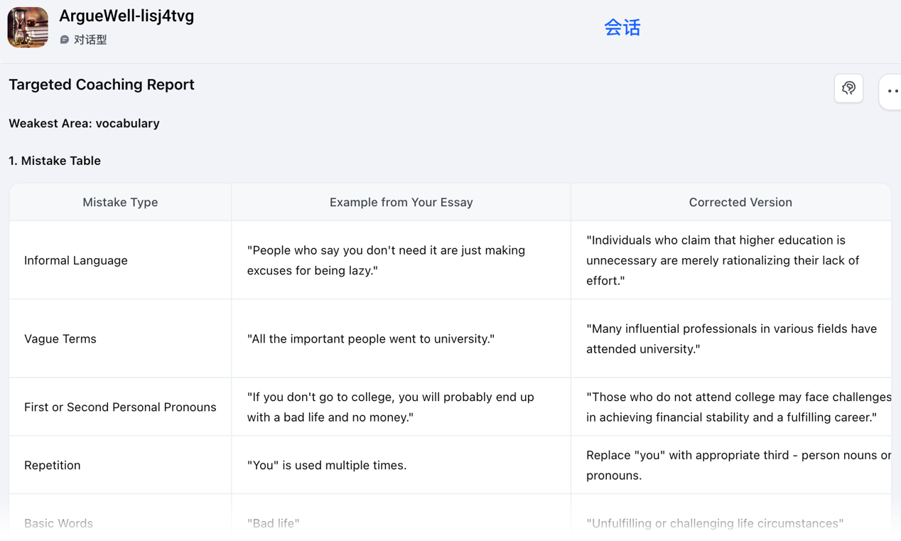 The agent then functions as a remedial tutor, generating personalised micro-lessons and practice tasks based on the student's own writing (See Figure 4). For instance, if “Vocabulary” is identified as the weakest area, the agent might isolate a sentence containing informal expressions and prompt the student to: “Rewrite the informal words or phrases in this sentence with more formal, academic alternatives.” Crucially, the agent also provides a model answer, allowing students to compare their response against a benchmark. The exercises follow Bloom’s Taxonomy, progressing from lower-order to higher-order thinking skills, for example, starting with identifying mistakes in a sentence, then rewriting a problematic sentence to remove issues, and finally creating a new sentence. This structured approach actively engages students in targeted practice, scaffolding the ability to diagnose and address their own weaknesses.