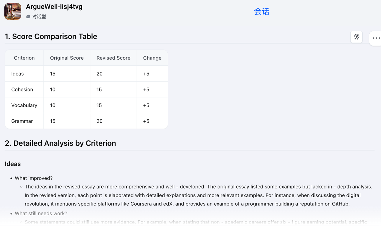 The three agents operate in a fixed sequence, guiding the student through a coherent learning cycle modelled on the principles of effective formative assessment set forth by Nicol and Macfarlane-Dick (2006). This design explicitly aims to develop the "procedural knowledge" for self-review that students currently lack (Andrade, 2010; Panadero & Jonsson, 2013). Each agent ends with a question or an instruction, and a positive response such as “yes” or “ok” initiates the next stage. For example, Agent 1 ends with, “Do you want an overall score and subscores based on the writing descriptor.pdf?” A positive answer leads to a detailed breakdown of the score across the four criteria, followed by the question, “Do you want to know your weakest area?” A “yes” response triggers Agent 2, and a subsequent action of uploading a revised essay to “Please upload your revised essay so that I can evaluate your progress and provide a detailed report.” triggers Agent 3.