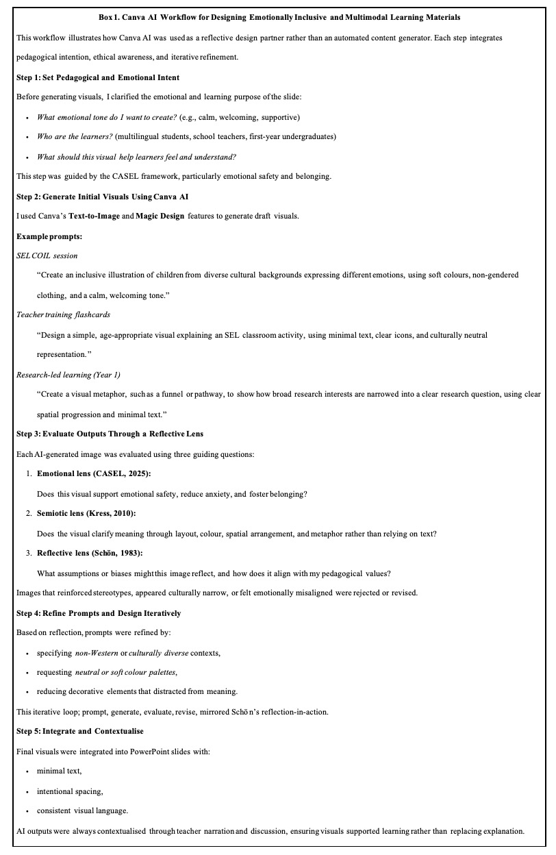 To translate these pedagogical and ethical insights into actionable practice, I developed a reflective workflow for using Canva AI in my teaching materials. Rather than treating AI as a tool for only efficiency or automation, the workflow operationalises emotional intentionality (CASEL), multimodal meaning-making (Kress), and reflection-in-action (Schön). The following box outlines this process, offering a practical illustration of how ethical, inclusive, and reflective AI use can be embedded in everyday teaching design.