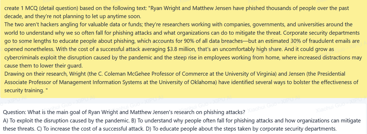 Drawing from the author's experience, in addition to considering various question types, optimizing the performance of XIPU AI in generating multiple-choice questions (MCQs) involves paying attention to various nuances when refining the prompts. Firstly, it is crucial to paraphrase questions and options to reduce dependence on direct text quotes from texts (e.g. correct answer B in Figure 2 is a direct quote from text), thereby enhancing originality and minimizing reliance on memorization. Secondly, to bolster comprehension, questions can be structured in alignment with the sequence of information provided in the text rather than based solely on question types. Thirdly, correct answers need to be randomly assigned among the options to enhance unpredictability and effectively challenge readers. Finally, to enhance the plausibility of distractors, it is essential to ensure that questions cannot be answered solely through world knowledge. However, it is not advisable to overload a single prompt with all these specifics. Instead, employing multiple prompts with slight modifications each time, following the approach of progressive-hint prompting(Zheng et al., 2023) can generate more desired items.