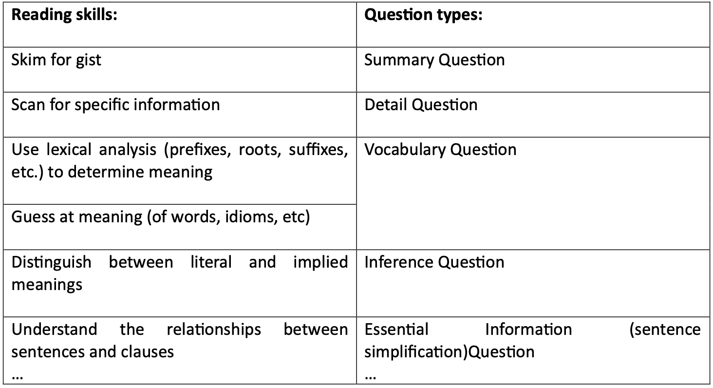 A valid reading test considers course content such as topics, learning objectives, reading constructs (skills required for readers to effectively manage the demands of the targeted language domain), and suitable difficulty levels (Brown, 2019). Despite GenAI's ability to rapidly generate questions, including multiple-choice questions (MCQs), from provided texts, doubts persist regarding its capability to create valid test questions due to its lack of exposure to specific module learning objectives, teaching materials, and students' language proficiency levels. The following chart illustrates an example of transferring reading skill constructs into multiple-choice question types.