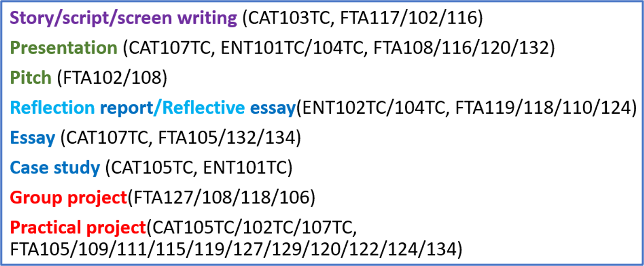 EAP117 was designed through a rigorous curriculum mapping process. We analysed assessments (see Figure 1) and consulted stakeholders across the four programmes within the AFCT to identify shared academic requirements, such as story/ script writing, project documentation, and oral communication. By focusing on these transferable competencies, the module equips students with language and soft academic skills directly applicable to their disciplines. Annual reviews ensure ongoing alignment with disciplinary evolution, and student feedback consistently affirms the module's practicality - a testament to ESAP's efficacy in bridging language and content learning.