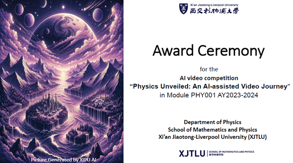 With the support of our department (Department of Physics) and our school (School of Mathematics and Physics), an award ceremony for the AI Physics Video Competition was organized to celebrate the hard work and achievements of our students. Prize-winning students were invited to give presentations to showcase their projects and share their experiences at the ceremony. In preparation for the award ceremony, I also used XIPU AI to generate some images for the opening and closing backgrounds (Figure 3-4).