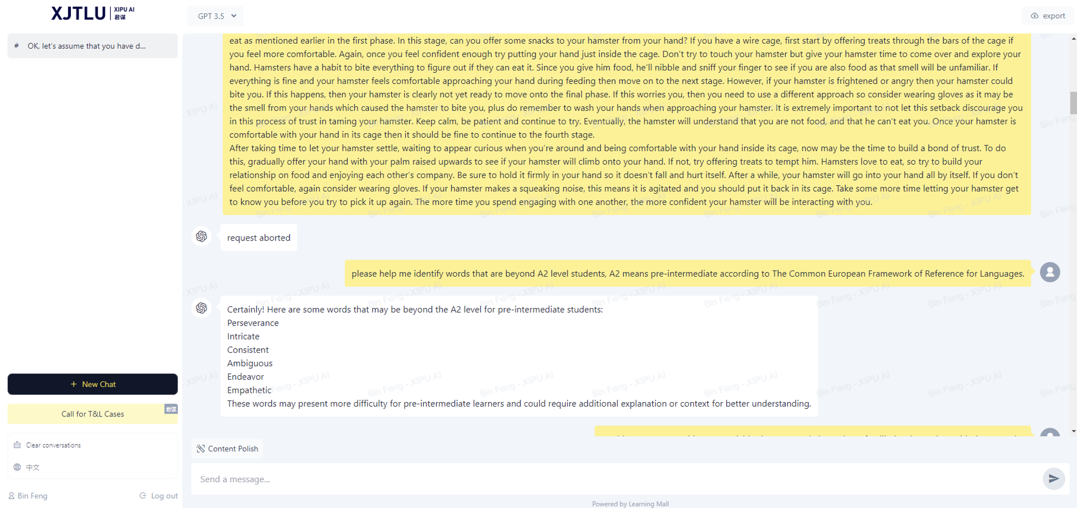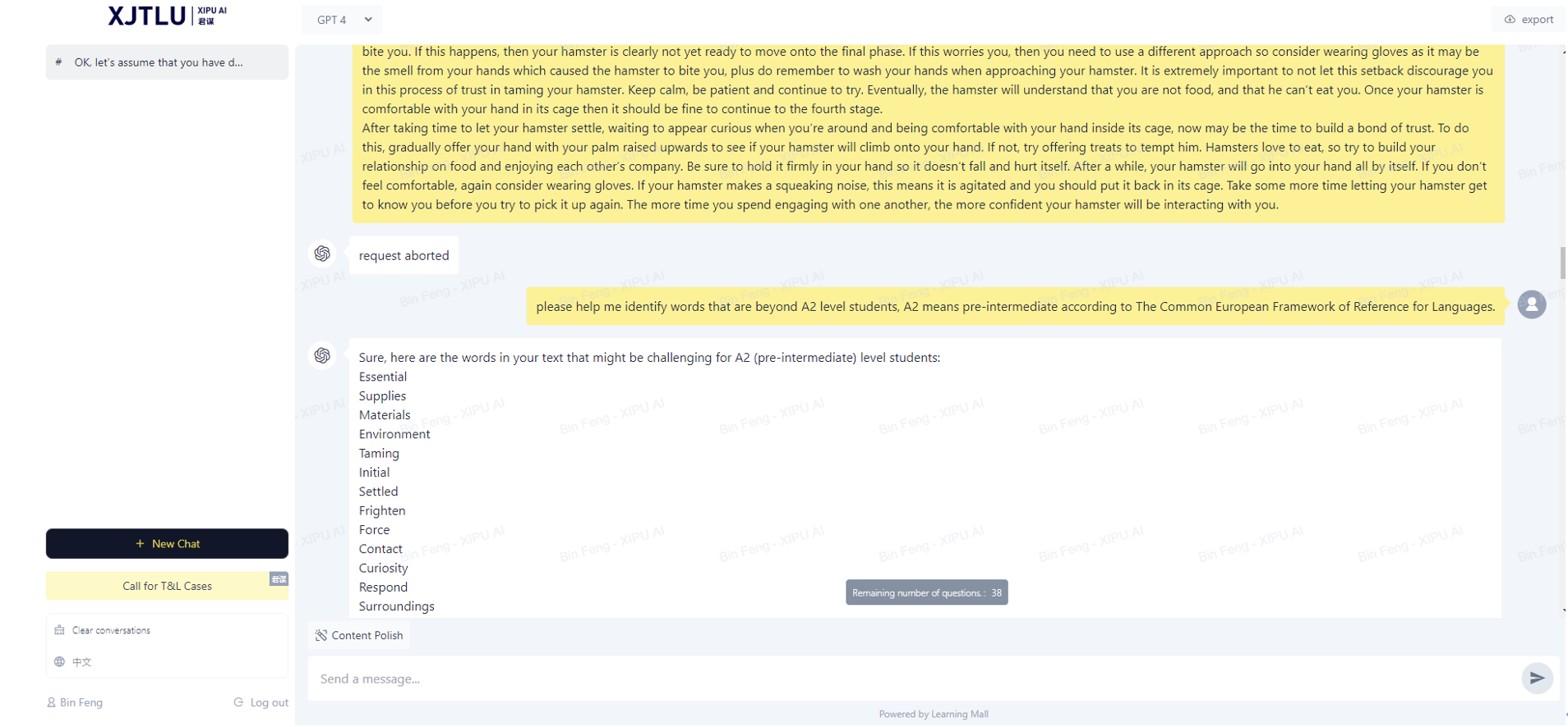 Since the launch of XIPU AI in September 2023, ELTs at the English Language Center of Xi'an Jiaotong-Liverpool University (XJTLU) have embarked on an exploratory journey of novel possibilities introduced by AI. Built on an OpenAI GPT model, this formidable chatbot holds a compelling allure, as testimonials from educators suggest heightened productivity and the facilitation of self-directed learning initiatives among students.
