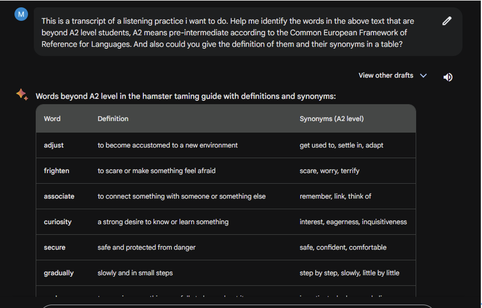 Traditionally, the compilation of a challenging word list demands painstaking manual effort, involving a meticulous examination of transcripts and dictionaries. With AI, however, the identification of these words was accomplished within seconds of submitting the transcript along with prompts such as “Identify words beyond A2 level” and “Provide definitions and synonyms in a table” Both XIPU AI and Bard responded effectively, as depicted in Picture 1 and Picture 2. Notably, the GPT3.5 version on XIPU AI requires more rigorous human review compared to the more advanced GPT 4.0 version or Bard (See Picture 3).