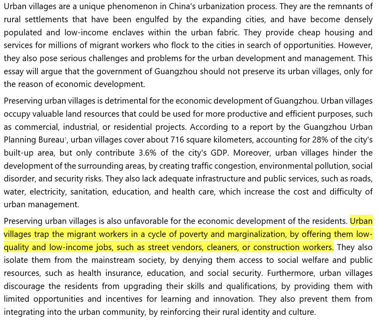As students engaged in constructing essays on the advantages and disadvantages of preserving historic structures, one student became captivated by a claim (See picture 7) suggesting that the preservation of such buildings could lead to economic disadvantages for urban village residents in Guangzhou, a southern city in China. However, this claim lacked explanation or support, creating a void that required filling for the argument to be effective and persuasive.