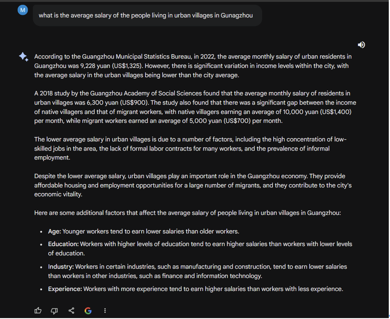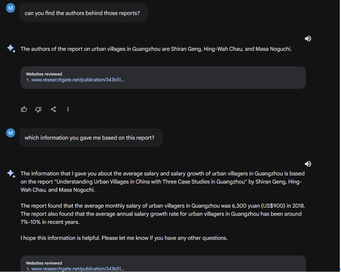 Bard’s contribution marked a commendable starting point for our inquiry. However, achieving a validated and citable answer was preceded by several failed attempts. Initially, our questions were too broad, such as "Give me research articles where I could understand the disparity between urban villagers and those outside the urban village in Guangzhou" and "Could you find the differences between urban villagers in Guangzhou and Guangzhou residents outside those urban villages in terms of their income levels, employment rates, and housing conditions." These queries resulted either in apologies or articles that did not match further search results, indicating Bard's fabrication of articles, now popularly known as hallucination.