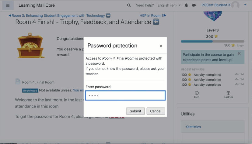 In this revamped format, participants must navigate through various digital escape rooms, progressing from one room to another. Their ultimate goal is to collect the coveted trophy and the attendance code. To successfully move forward, participants must not only engage with their preferred learning materials but also demonstrate their level of acquisition of specific knowledge by entering the correct password for the next room. This innovative approach provides an immersive and interactive learning experience, allowing participants to explore at their own pace and actively demonstrate their understanding and mastery of the course content at the same time.