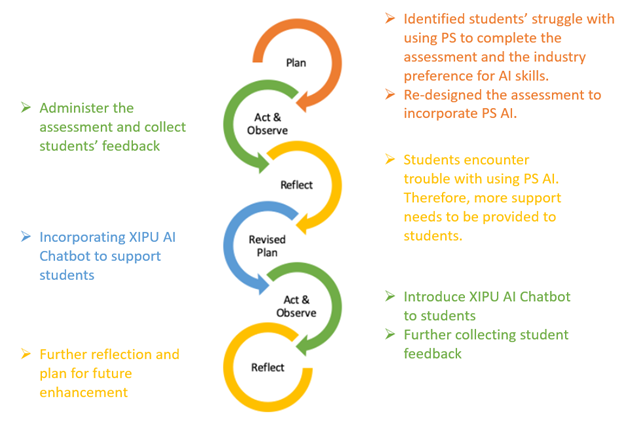 This research represents a significant innovation in teaching practices by integrating cutting-edge AI tools into authentic assessments. By combining PS AI and the XIPU AI chatbot, the initiative not only addresses the challenges students face in mastering complex software but also aligns their learning experience with industry expectations in the first round of “plan, act and observe phase, revised plan” phase. Then, the further act and observe phase can verify the positive practice in a theoretical module and display its wider application. The action research methodology ensures a systematic approach to refining the innovation, with iterative feedback and collaboration driving its success. Moreover, this approach is highly transferrable from design modules to other teaching contexts. AI-enhanced authentic assessments and targeted support tools like chatbots can be adapted across disciplines to foster deeper learning, improve student engagement, and enhance employability skills.