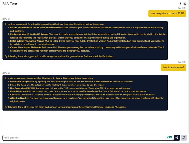 Based on the reflections and identified issues, the teaching team decided to create a customized chatbot using the XIPU AI Chatbot function on the Learning Mall page of the module. The chatbot was trained with comprehensive solutions to address frequently asked questions and detailed guides for using Photoshop AI. This allows students to interact with the chatbot at any time to receive step-by-step instructions and resolve their issues and questions on registration and creating effective prompts. See Figure 2 for an example of how the chatbot can assist students in producing high-quality work to fulfil the assessment requirements. In addition, the teaching team is also proactively seeking updates to PS AI and exploring alternative AI-enhanced professional design tools to empower students in creating the required assessment outputs.