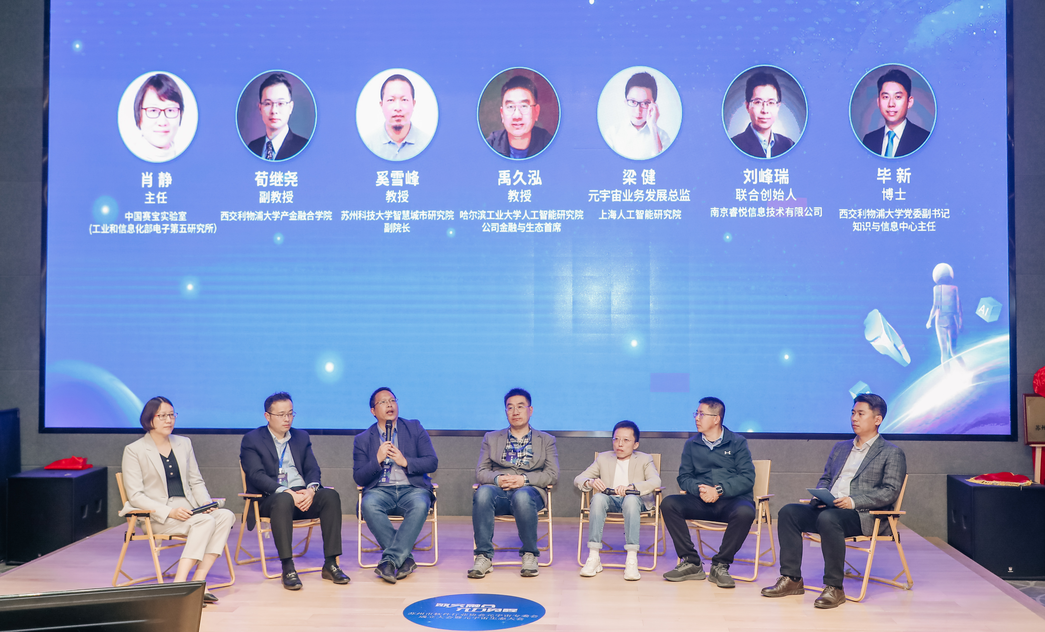 会上还进行了“元宇宙产业生态发展圆桌论坛”环节。来自中国赛宝实验室(工业和信息化部电子第五研究所华东分所)、西交利物浦大学、苏州科技大学、哈尔滨工业大学人工智能研究院、上海人工智能研究院、南京睿悦信息技术有限公司的学者专家,就元宇宙的未来发展方向与人才培养等主题进行多维度的探讨交流,毕新博士担任论坛主持人。