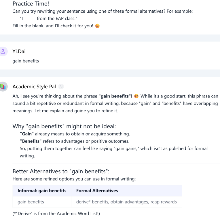Academic Style Pal并非仅对学生的用词是否正式进行机械判断,而是通过引导性练习与反思(见图14)激励学生主动学习,帮助其逐步在实践中发现语言的细微差异。然而,需要强调的是,Academic Style Pal仅是学生学习工具包中的一个组成部分,为达到最佳效果,需要与结合其他EAP教学资源与材料结合使用。该工具的设计初衷是作为辅助支持,而非替代传统教学,旨在帮助学生在自主探索与反复练习的过程中,逐步理解并掌握学术写作的语言规范。