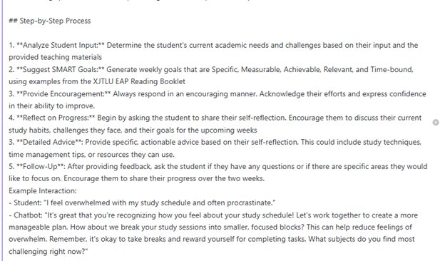 为了提高学生的自主学习能力,帮助他们监控自己的学习情况,我们在学习平台中嵌入了一个名为 "Smart Agent "的人工智能聊天机器人。聊天机器人可以帮助学生总结或分解材料,并帮助他们设定目标。调查显示,所有参与者(n=6)都表示使用了人工智能聊天机器人来评估他们对课程材料的理解。这种一致采用的情况表明,研究对象的人工智能素养有了显著提高。将人工智能工具整合到学生的学习过程中,不仅表明学生对此类技术的使用更加得心应手,而且还表明了利用人工智能进行学业自我评估的方法。