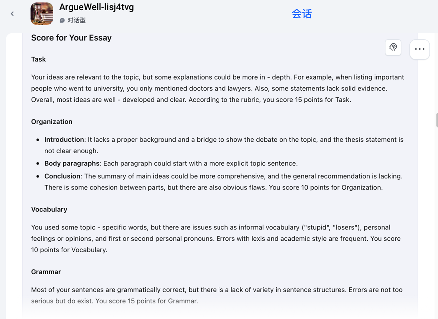 · 情感激励要素:通过平衡的表扬肯定学生的写作优势,维持其学习积极性,区别于通用人工智能工具的机械性反馈语气;