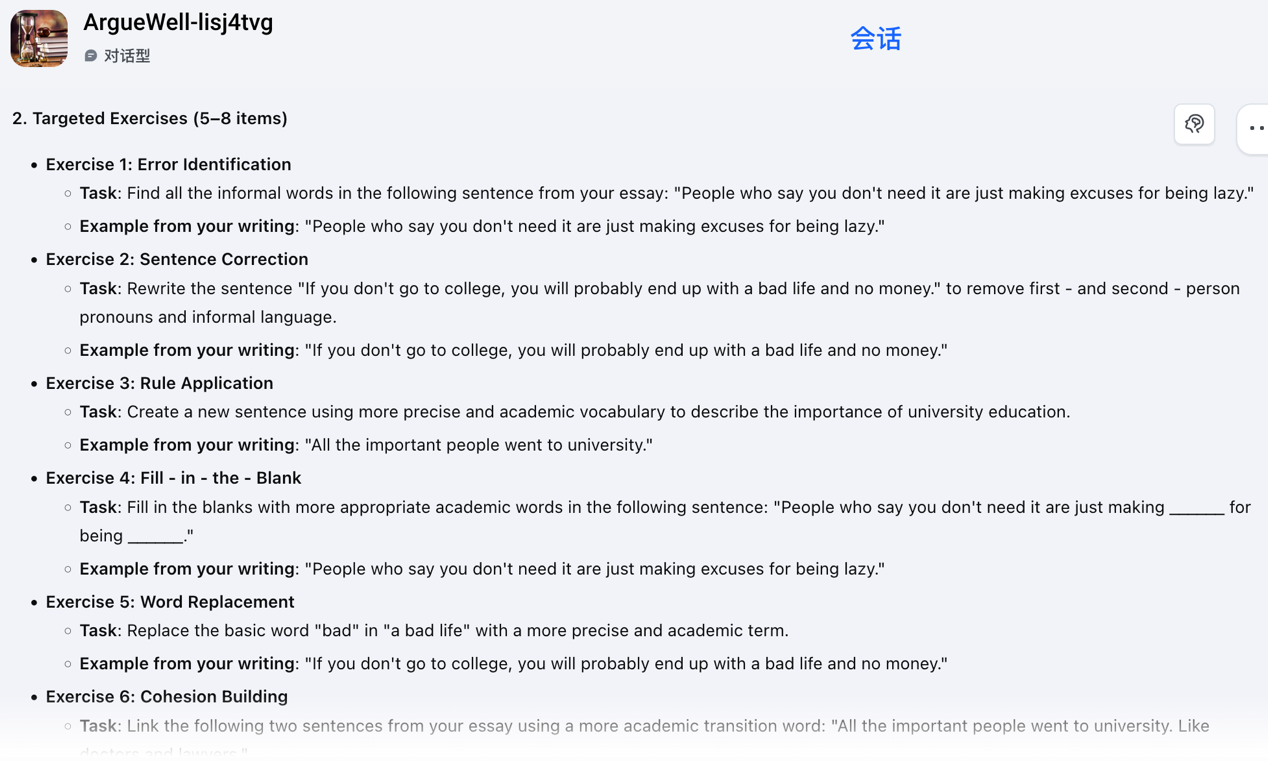 随后,该智能体将扮演写作辅导教师的角色,结合学生的原文,生成个性化的微型专题课程与练习任务(见图 4)。例如,若 “词汇运用” 被判定为薄弱环节,智能体会筛选出原文中包含非正式表达的句子,并向学生提出练习要求:“请将句中的非正式词汇或短语替换为更正式的学术表达”。尤为关键的是,智能体还会提供参考范例,供学生对比自查。练习任务的设计遵循布鲁姆教育目标分类学,按照从低阶到高阶思维能力的顺序递进,例如:先要求学生识别句中的错误,再引导学生修改有问题的句子,最后让学生基于所学知识创作新句。这种结构化的练习设计,能够引导学生主动参与针对性训练,逐步掌握诊断并解决自身写作问题的能力。