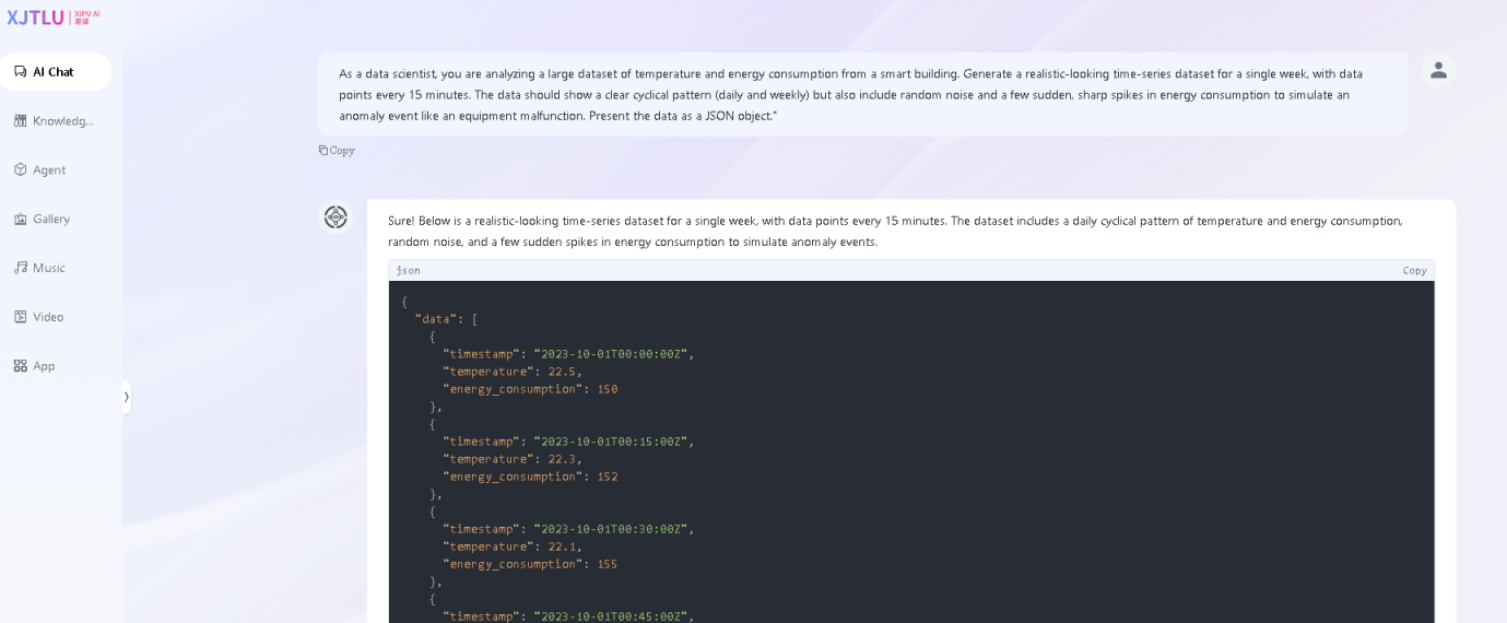 时间序列分析的示例提示: “作为一名数据科学家,你正在分析来自智能建筑的大型温度和能耗数据集。生成一个为期一周的、外观逼真的时间序列数据集,数据点间隔15 分钟。数据应显示清晰的周期性模式(每日和每周),但也应包含随机噪声和一些突然、急剧的能耗峰值,以模拟设备故障等异常事件。以 JSON 对象的形式呈现数据。”