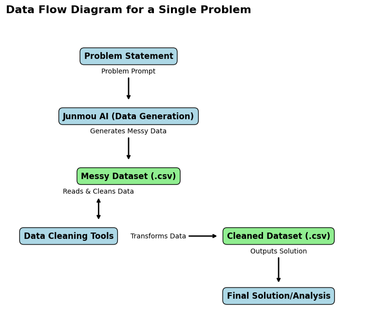 此图表展示了一个教学框架,其中 AI 君谋(Junmou) 是一个核心工具,用于创建动态且迭代的学习环境。该循环始于教育者设计一个问题提示。随后,君谋会生成一个“杂乱的”数据集,为每个学生带来独特的挑战。接着,学生们参与故障排除和技能应用,以清洗和整理数据。最后,学生的作业提供了宝贵的反馈和新见解,这些信息为教育者的下一次问题设计提供了参考,从而完成了闭环,并促进了学习与改进的持续循环。