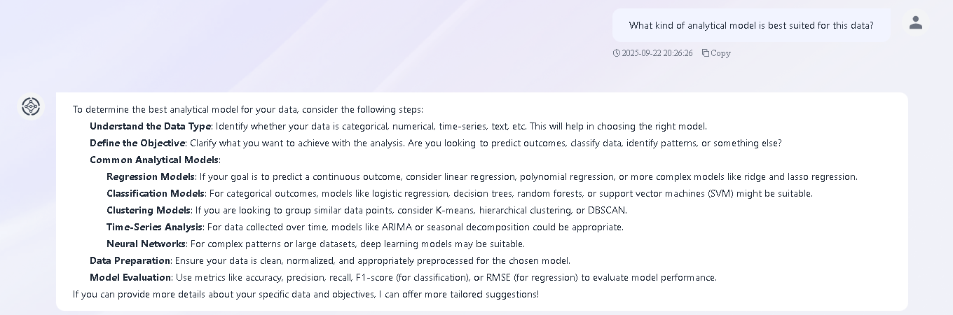 AI 解释数据模式的能力也被利用。在完成分析后,学生会使用君谋提出问题,例如“哪种分析模型最适合这种数据?” 。AI 的回复将作为课堂讨论模型选择和验证的基础。