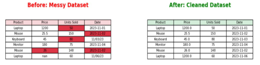该图直观地展示了数据整理的影响,展示了数据集的“之前”和“之后”视图。“之前”的表格突出了常见的现实世界数据问题,例如混合数据类型(例如,“Price”列中作为字符串的“45”)、缺失值(NaN)和不一致的日期格式。“之后”的表格显示了已更正的数据,说明了如何通过系统的清理过程获得一个干净、一致的数据集。这种转变对于准确的分析和建模至关重要。