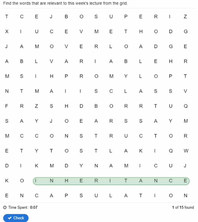 为克服语言障碍,我们创建了一个在线交互式术语表,其中包含了对每个英语术语的含义解释,并且每周会在我们学校的虚拟学习环境(VLE)学习超市上不断更新此表。这样,学生在学习编程语言的同时,还能学习编程所需用到的外语。通过这一技术的应用,老师和学生都能随时随地对术语表进行协同创建和编辑。此外,我们还使用Moodle Quizzes和H5P工具来创建英语学习游戏,旨在测试学生的英语知识。其中一个例子就是拼词游戏,学生需要找出课上讲到过的单词。通过玩类似的游戏,学生可以从中发现学习语言的乐趣!