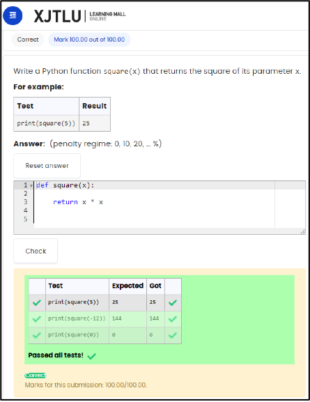 为了解决这些难题,我们在三年前就开始在学习超市中使用名为CodeRunner的Moodle插件。这一插件可以对代码进行自动打分,并根据测试用例的正确性给予反馈。学生在线提交作答的代码后,立即能得到代码是否通过测试用例的结果。问卷调查显示,当系统报告代码成功通过所有测试用例(在下图中绿色方框中显示),我们的学生会获得一种极强的成就感。