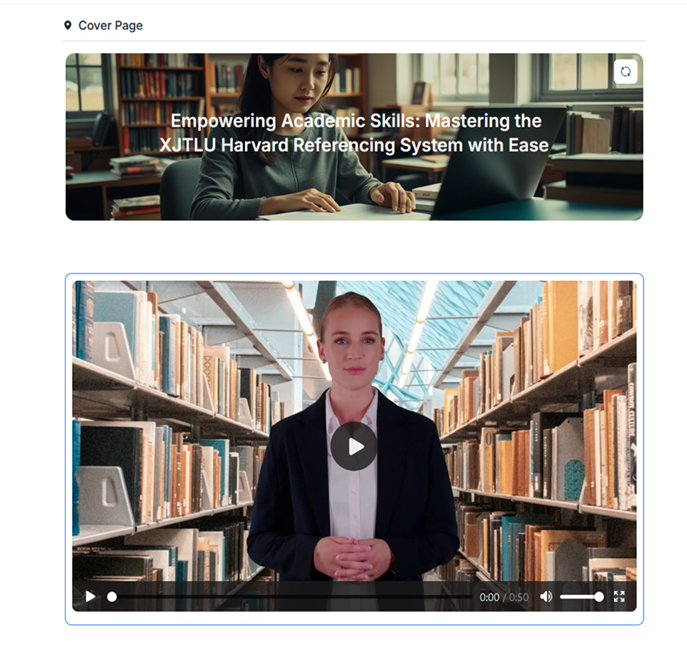 封面页通过一段内嵌的AI讲解员短视频(见图1)概览西浦的哈佛引用系统,并提供简明的在线课程导航。为提升学习效率与个性化体验,学习者可按需选择学习路径:例如,直接在菜单中跳转到所需的引用技能,无需线性逐课完成。