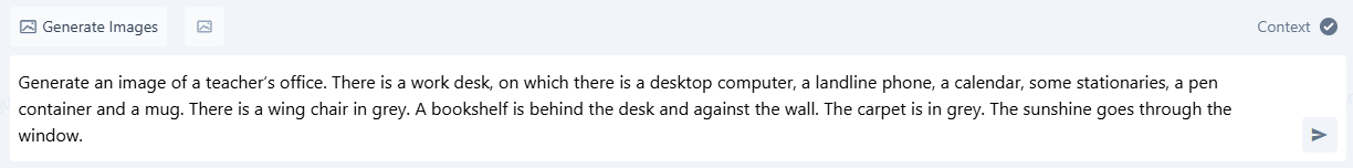 教师需要在课堂上示范如何编写有效的指令。首先,指令要以一个具可操作性的动词搭配目标图像主题作为开头(例如,“生成一张/可视化一张/想象一张教师办公室的图片”)。 接着,添加物体、颜色、位置和背景等具体描述细节,丰富指令内容。在这个过程中,学生要运用自身词汇知识和创造力来调整自己的指令。例如,以下的示例指令演示了如何通过描述具体的办公室物品、物品颜色及其位置来可视化一张教师办公室的图片(图 1至图2)。这不仅巩固了前一课所学的“landline phone” “stationeries”和“wing chair”等词汇,还使学习体验更加有趣和生动。一旦学生熟悉了编写提示词的过程,复习任务的完成会随着时间变得更加高效。