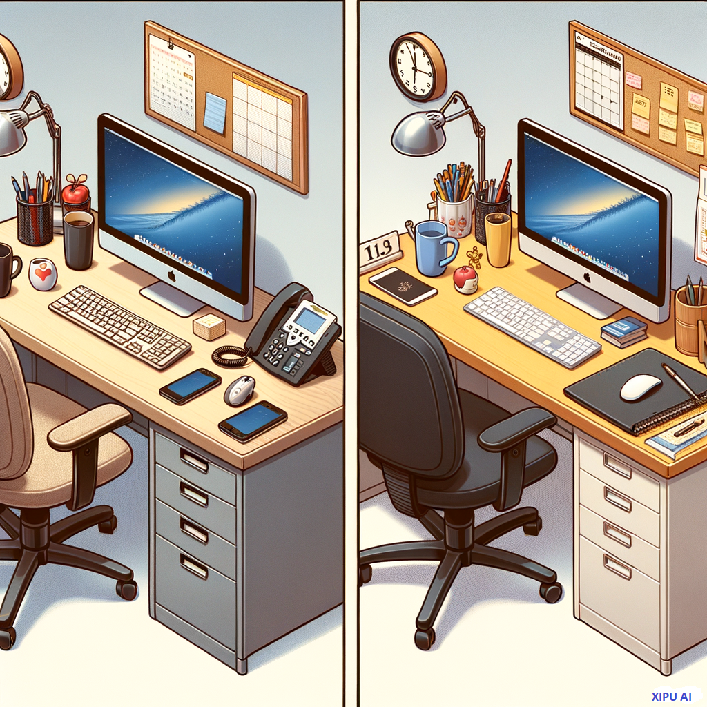 课前,教师可以使用XIPU AI生成两张相似的图像。在编写指令时,务必指明两张图像之间的显著差异。例如:“生成两张教师办公室的图像,背景和角度一致。第一张图像里有一张办公桌,上面有一台台式电脑、一部固定电话、一个笔筒和一个马克杯。在第二张图片中有一张办公桌,上面有一台台式电脑、一部手机、一个笔筒和一个日历”。