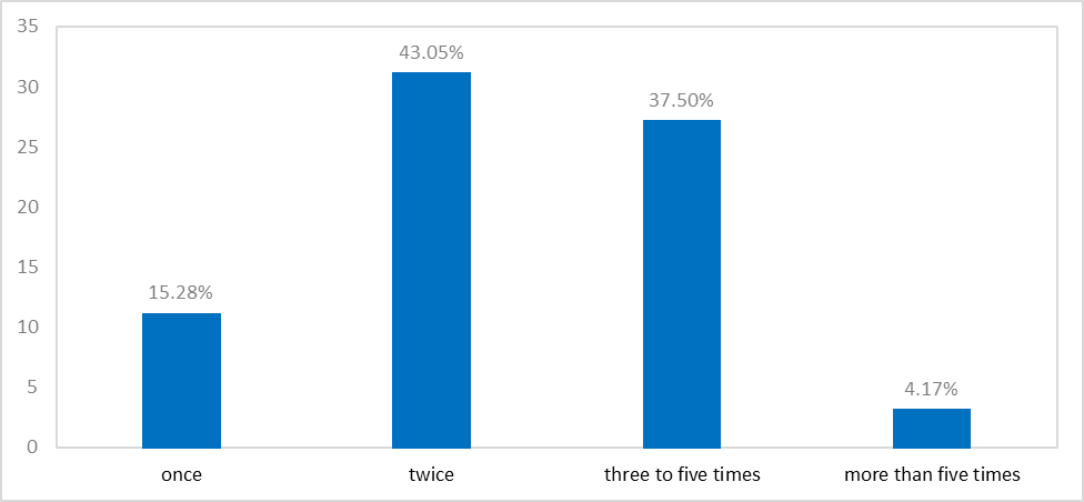 首先,学生们高度认可人工智能生成图像在提升词汇记忆方面的有效性。在态度测试中,参与者按照从“无效”到“非常有效”的五点李克特量表,评估借助人工智能生成图像进行词汇学习的效果。图表 一 显示,平均分为 M = 3.75(标准差 SD= 0.968,样本量N = 72),表明学生总体态度积极。值得注意的是,大多数学生(69.44%)认为这种方法对于词汇复习有效(50%)或非常有效(19.44%)。此外,学生们经常将这种学习方法描述为“有趣”“生动”“有趣味”“形象化单词”“互动性强”“实用”“有意义”“沉浸感强”“更容易记住新单词”以及“有效,因为生成的图像与所学单词相匹配”。许多人强调其实用性、有意义和沉浸感强的特点,指出它使记忆新单词变得更容易。另外,大多数参与者(64.5%)声称,使用 XIPU AI 生成图像激励他们更多地参与词汇使用,从而提高了词汇记忆效果。这种积极性转化为更高的参与度,促使学生反复尝试用 AI 生成图像(见图表二)。超过40%的学生需要反复尝试两次以获得满意的目标词汇图像,超过三分之一的学生尝试了三到五次,而在这一过程中他们也进一步熟悉了单词的拼写和含义。